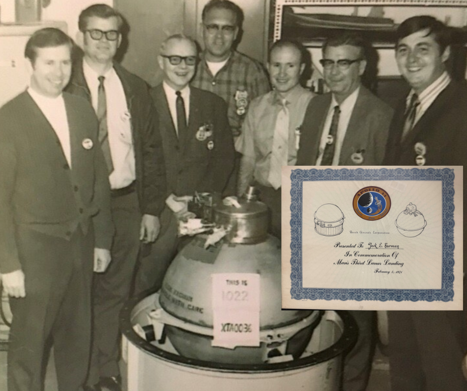 Pictured above: Jack Burman (far left) and the team that helped put humans on the moon, and Jack’s Commemorative Certificate for his work on the Apollo missions